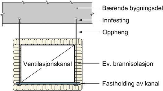 Komponenter som inngår i opphengssystem for ventilasjonskanal og hvor det er krav om brannmotstand. Oppheng for installasjoner som går igjennom brannskille, skal ha samme brannmotstand som brannskillet.